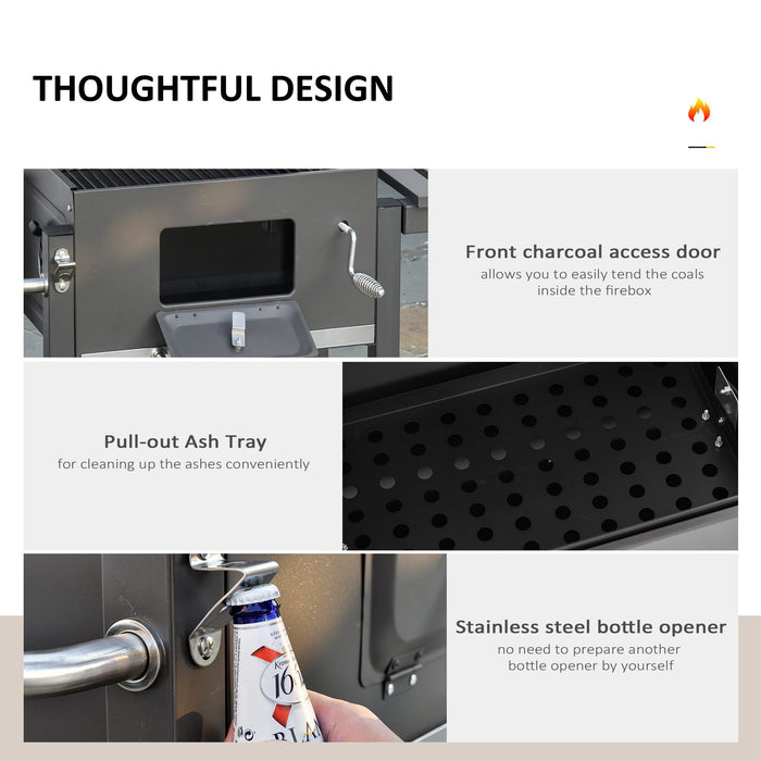 Take control of your cooking with our innovative temperature control system. The adjustable charcoal pan allows for precise heat management with a simple turn of the hand crank. Adding charcoal is a breeze through the convenient access door. The lid not only conserves heat but also comes with adjustable vents and a thermometer for comprehensive temperature regulation.