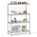 This multifunctional storage solution, known as a kitchen utility rack, boasts ample space with a spacious countertop, 3 sturdy shelves, a hanging net, and detachable hooks. Its innovative design allows for easy customization to fit items of various sizes, with adjustable shelves and a customizable hanging net that can be modified with 3 cm increments. Crafted from multi-layered metal, this kitchen storage rack can support up to 195 kg. 4 universal wheels, including 2 lockable wheels, make it easily switched between usage scenarios at any time. Cleaning is a breeze with the detachable shelf liner, and installation is made simple with convenient spiral connections. Large Storage Capacity: The bakers rack has a wide countertop for your microwave or coffee maker, 3 sturdy shelves for dishes or jars, a versatile hanging net for fruits or vegetables, and 4 detachable S-shaped hooks for hanging utensils, pots, or towels. Height Adjustable Design: Featuring 3 adjustable shelves and a customizable hanging net, each with 250 mm increment options, the coffee bar table provides the flexibility to accommodate a variety of item sizes, from large appliances to small spice jars. Robust Metal Structure: The microwave stand comes with a strong metal structure, effortlessly supporting up to 195 kg. The tubes are constructed with a multi-layered design, including a powder coating layer, an anti-corrosion and wear-proof layer, and titanium steel layer. Effortless Mobility: Equipped with 4 smooth, wear-proof universal wheels, the utility storage rack glides easily across any floor surface. 2 lockable wheels provide stability and security when you need it, allowing you to lock the rack in place for safe use. More Superior Details: The included detachable shelf liner simplifies cleaning. Simply wipe it with soap or water for a spotless finish. Plus, the kitchen storage shelf’s spiral connections make installation more convenient.