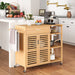 Designed for optimal storage, the storage cart features a countertop, a drawer, a 2-door cabinet, and side shelves that are perfect for keeping kitchen essentials. The built-in towel rack doubles as a handy push bar. Mobility is a breeze with its 4 universal wheels, 2 of which are lockable for stability when needed. The slatted design of the shelves and doors ensures proper ventilation, keeping items fresh. Perfect for kitchen, dining room, or living area, this kitchen cart with well-designed details combines style with practicality, making it an essential addition to your home. Bullet Point:Premium Bamboo Structure: Mainly made of bamboo, this kitchen island cart boasts a well-painted surface that is splinter-free and easy to maintain. The bamboo construction is also high-hardness for long-lasting use and natural elegance. Ideal Home Organizer: The storage cart features a spacious countertop, a large drawer, a 2-door cabinet, and 3-tier side shelf, providing ample storage options. Moreover, the convenient towel rack can double as an easy-to-grip push bar. Safe and Smooth Movement: Equipped with 4 universal wheels, the sideboard features easy maneuverability around your living space. 2 of wheels with brake make the rolling cabinet easily located anywhere you want, offering both mobility and stability. Slatted Shelves and Doors: The aesthetic slatted design of the shelves and cabinet doors enhances visual appeal. This thoughtful design also promotes ventilation and keeps contents fresh and dry, perfect for storing a variety of items. Perfect Indoor Addition: With elegant design and functional features, this bamboo kitchen island cart is a versatile addition to kitchen, dining room, or living area. Overall dimension: 104 x 40 x 89cm (L x W x H).