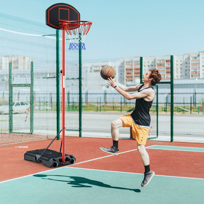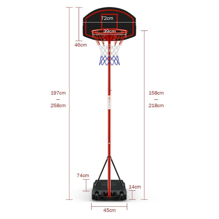 Made with the highest quality materials, the hoop proudly boasts a sleek black and red design. Crafted from strong steel, resilient HDPE, and robust nylon, it's meant to last. The main body measures 119 cm x 46 cm x 197–258 cm (L x W x H) to accommodate various play areas. The backboard, coming in at 72 cm x 46 cm (L x W), offers plenty of surface for bank shots, with the rim's inner diameter sized at 39 cm. The stable foundation measures 74 cm x 45 cm x 14 cm (L x W x H), guaranteeing a firm base for your hoop. Weighing in at 8 kg, it's hefty enough for stability yet light enough for easy maneuverability. Each purchase includes 1 basketball hoop and 1 instruction manual, so you can jump into action quickly.