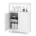 Designed with functionality in mind, this floor cabinet fits seamlessly into your bathroom, living room, or entryway, offering a smart solution for tidying up and decluttering. It features 2 doors, an open compartment and a 3-position adjustable & removable shelf, offering roomy and flexible storage for your items. The doors include a practical magnetic catch to prevent any unwanted opening. An anti-toppling device is included to anchor the cabinet securely to the wall, providing added stability and security. Additionally, this bathroom cabinet comes with non-slip foot pads to increase stability and protect the floor from scratching. If you are looking for such a product, do not hesitate to buy it! Multiple Storage Options: Featuring a wide top, an open compartment and 2 doors, this floor cabinet provides large storage space for various items. Plus, the shelf in the cabinet is 3-position adjustable and removable, allowing personalized organization of all your essentials. Multi-scene Application: This freestanding storage organizer is designed not only for the bathroom, but also can be used in your living room, entryway, kitchen, etc. The modern simple style complements any home decorations. Sturdy Construction: Crafted from thick boards, this bathroom cabinet ensures great sturdiness and durability. The anti-toppling device enhances overall stability and safety, while the anti-slip foot pads protect floors from scratches. Considerate Design: The convenient handles make it easy to open the cabinet. In addition, this floor storage cabinet features a magnetic catch to secure the doors, which better protects your items. Worry-Free Maintenance: The smooth painted surface of this freestanding bathroom storage cabinet not only adds to its visual appeal and durability but also makes cleaning hassle-free.