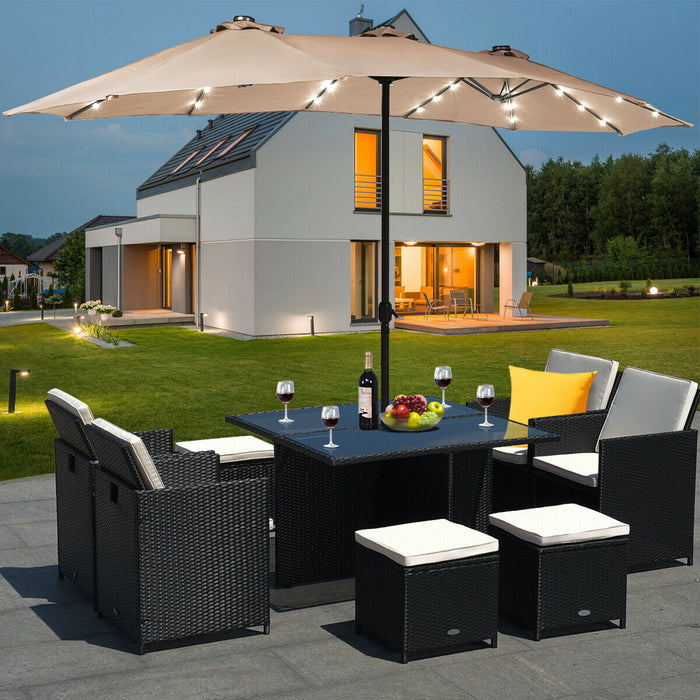 Our umbrella's expansive double-sided canopy is designed to cater to larger outdoor ensembles, perfectly complementing a wide array of furniture arrangements and providing an immense area of reprieve from the sun's rays.