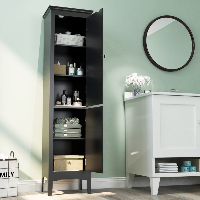 This freestanding cabinet's thoughtful dimensions ensure it fits snugly into tighter spaces while offering substantial storage. The slim yet capacious design allows you to maintain a clutter-free area, keeping your items neatly stowed away.