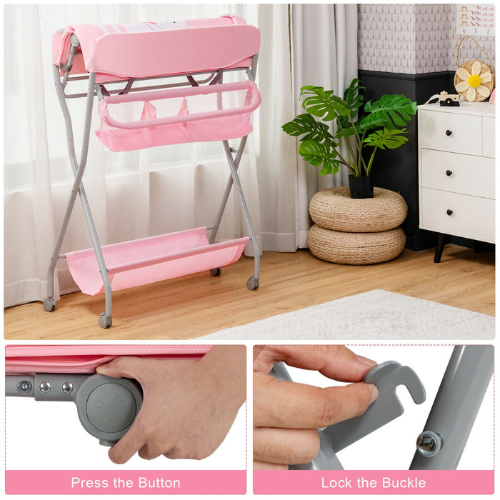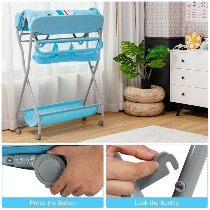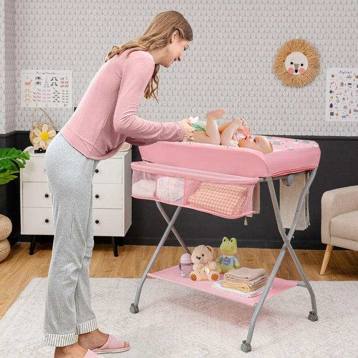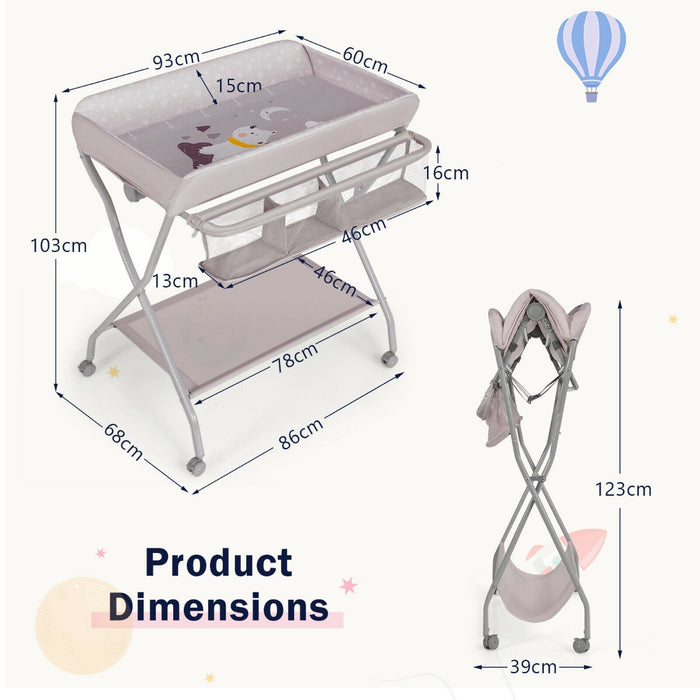 This baby care station was created with parents in mind. The ergonomic height spares you the aches of bending over, aligning perfectly with your comfort. Outfitted with a storage shelf, your essential items are within reach, making diaper changes and clean-ups efficient. Plus, the table includes lockable wheels enabling you to move the station with ease throughout your home, ensuring your baby's needs are always within arm's reach.