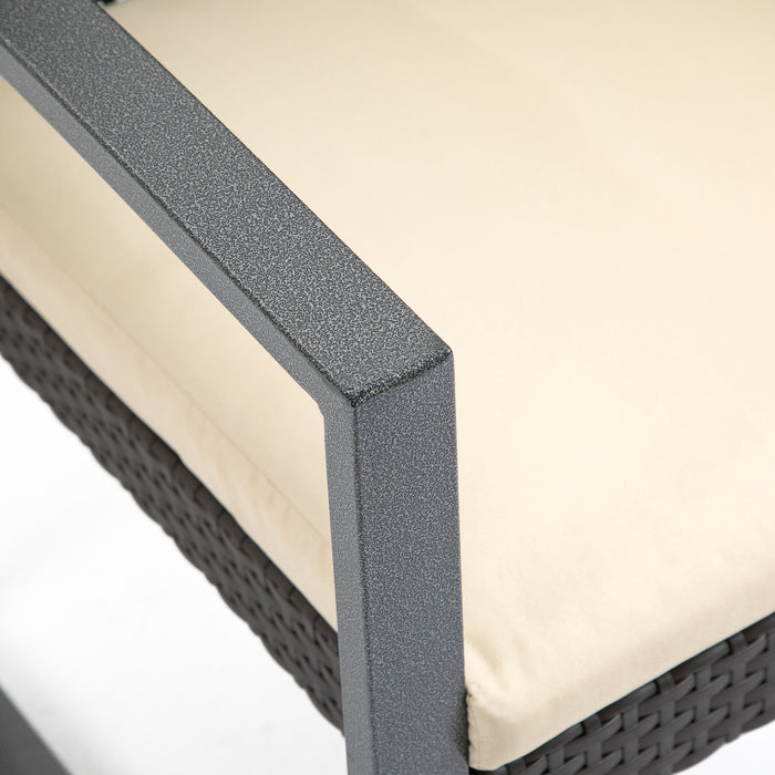The allure of natural rattan takes a contemporary twist with this set's simulated rattan construction - a robust, all-weather design that does not compromise on style or durability. The elegant silhouette is not only a visual delight but also ensures hassle-free maintenance, allowing you more time to enjoy leisurely outdoor life.