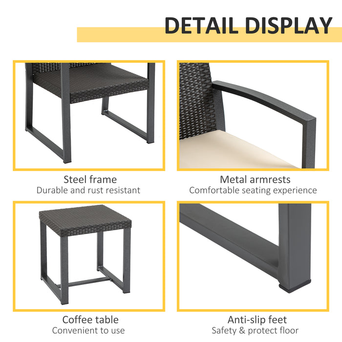 Despite its compact footprint, this set boasts generous proportions that don't skimp on space or comfort. The chairs measure 58cm in width, 58cm in depth, and 84cm in height, giving ample room to lounge, while the coffee table, at 44cm long, 44cm wide, and 46cm high, offers enough surface for your coffee mugs and more.