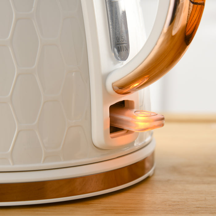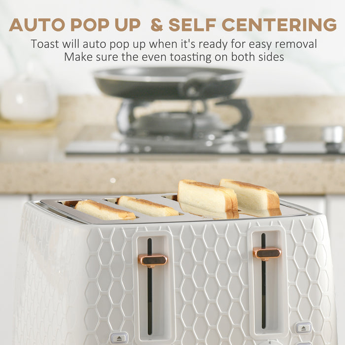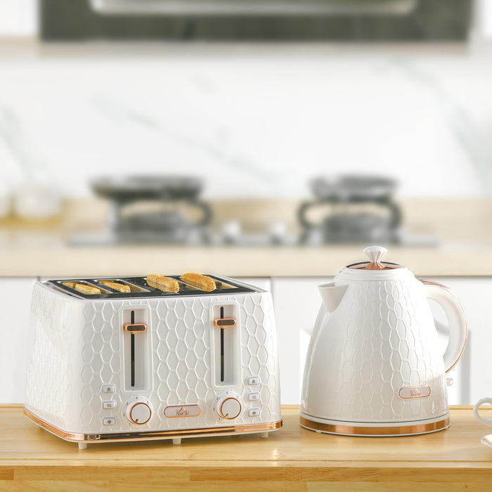 Begin your day in sophistication and ease with our sleek breakfast duo. This set, comprised of an electric kettle and a complementary four-slice toaster, boasts a contemporary design with a chic honeycomb pattern and luxurious chrome details. Perfect for both quick breakfasts and leisurely brunches, this pairing not only delivers performance but also adds a touch of elegance to any kitchen countertop.
