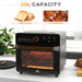 Whether preparing a meal for yourself or entertaining guests, the oven's generous 20L capacity is well up to the task, offering ample space to cook multiple items simultaneously. Easily fit 8 slices of toast, an 11-inch pizza, or even a whole chicken. The intelligent three-tier design, inclusive of an oven rack, air frying basket and a deep baking pan, ensures efficient meal preparation for any occasion.