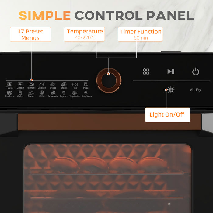 Embark on a gastronomic journey with complete control over your cooking. The appliance boasts an expansive temperature range from 40°C to 220°C, accompanied by a comprehensive 12-hour timer. Choose from 17 convenient presets tailored to cook a variety of dishes to perfection: from crispy chicken wings and succulent steak to heavenly pizzas and delightful desserts.