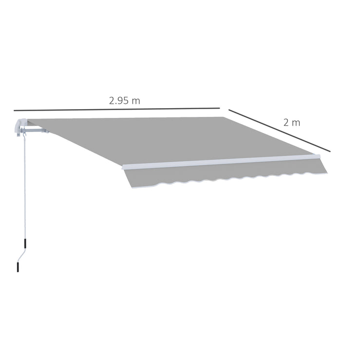 This spacious awning measures a substantial 295L x 200W cm, with a conveniently long handle of 150 cm to ensure easy reach and operation. Please note, while our awning is designed for resilience, it is recommended to retract during adverse weather conditions to preserve its quality and safety. The minimum installation height requirement is 2.5 meters to ensure optimal performance.
