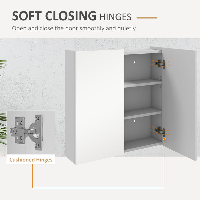 The cabinet's two mirrored doors offer a clean, streamlined look and are equipped with soft-closing hinges, providing convenience and tranquility to your morning routine. Behind these doors lies a well-organized storage system, featuring two robust shelves that neatly conceal all your bathroom necessities. Keep your counter space clear and your products easily accessible with this chic storage option.