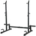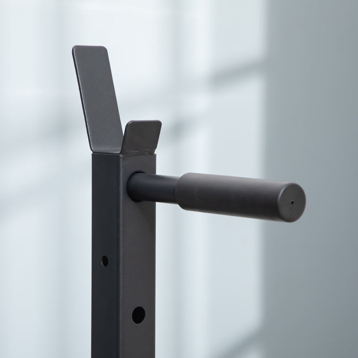 Embrace the reassuring stability of a solid steel frame designed to support your most rigorous fitness regimens. The robust structure allows you to push your limits with confidence. For added security, the rack features J-hook brackets to safely hold barbells and rubber feet caps that prevent slipping, ensuring a fixed position throughout your training.