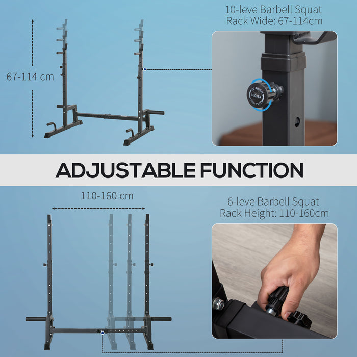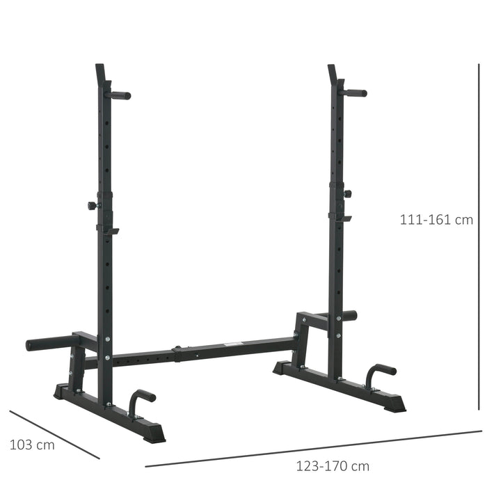 Our barbell rack stands ready to accommodate your workout with dimensions of 111-161H x 123-170L x 103W cm and a max load capacity of 150 kg. Tailoring this rack to individual preferences is straightforward, with adjustable heights and widths to conform to various body types and workout styles. Assembly is a breeze, setting you on the path to achieving fitness goals promptly.