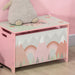 Your child will be absolutely smitten with the box's eye-catching pink hue and whimsical decorations that include rainbows, mountains, and hearts. Not just a storage item, but a playful piece that injects fun and color to any child-centric space, making it an excellent addition to bedrooms, playrooms, nurseries, and other areas.