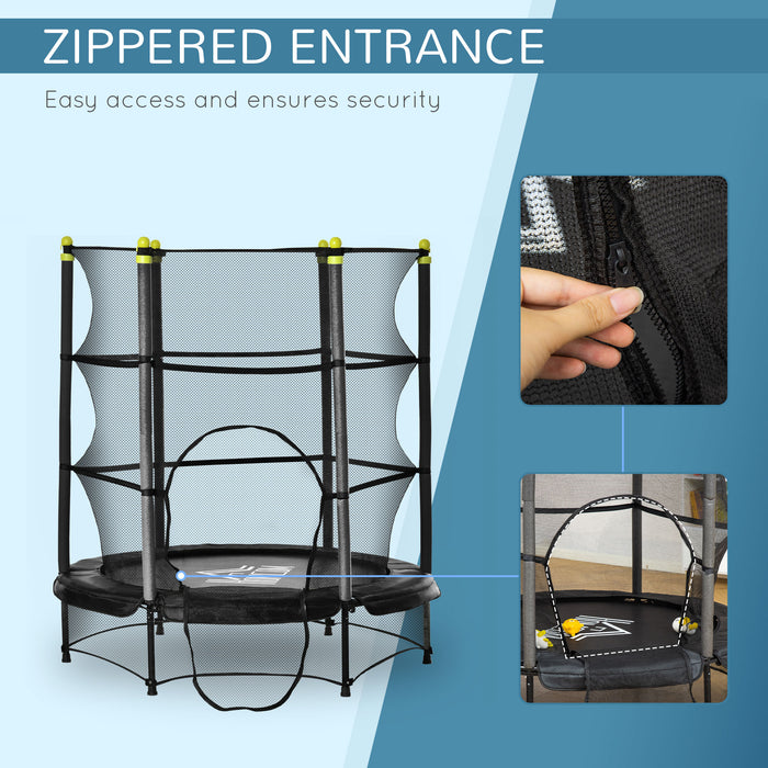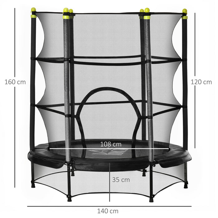 Our trampoline is crafted from superior materials including a steel frame, PP, and EPE for resilience and safety. The trampoline sports a sleek black color for a modern look. It measures 160H x Φ140cm with an enclosure net height of 120cm and supports a maximum load of 50kg. Bearing the item label 342-008V01BK, this trampoline is sure to be the highlight of playtime.