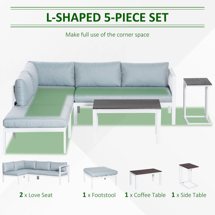Introducing a luxuriously designed five-piece, 'L' shaped patio set that effortlessly enhances any outdoor space. Whether you're creating a cozy corner in your backyard, furnishing a balcony, or expanding your outdoor entertaining options, this set is designed to fit perfectly into a variety of outdoor settings.