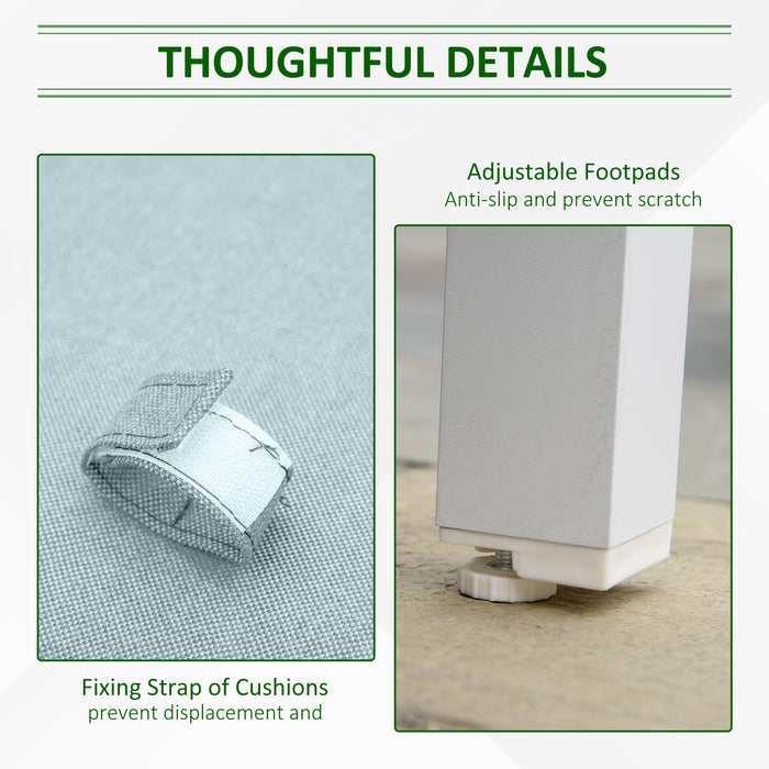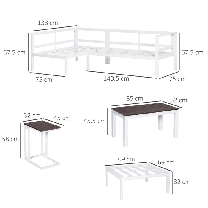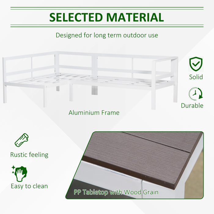 This set's sturdy aluminium frames guarantee long-lasting use through countless seasons. Equipped with anti-slip feet, this furniture not only protects your floors but also delivers stability and peace of mind. Finished with a sleek white exterior and complemented by natural brown wood-like tabletops, the pieces convey modern elegance while promising resilience.