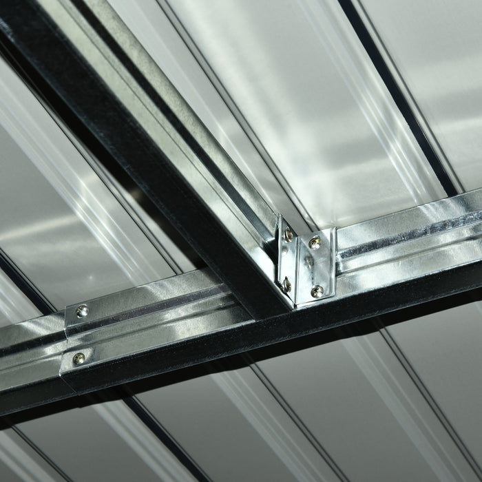 Finished in an elegant dark grey tone, this shed's colorway complements any outdoor setting with ease. Made with superior galvanized steel and PP materials, it confidently carries a snow capacity of 20Kg/m². Marked with the label '845-032CG', this structure represents excellence and modernity in outdoor storage.