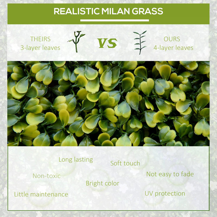 Each panel in our set of twelve features an impressive high-density design, boasting approximately 400 lush clusters of Milan grass, meticulously crafted for a life-like appearance. This dense mat of greenery provides a natural and aesthetically pleasing look, ideal for personal or commercial spaces such as backyards, patios, or event venues.
