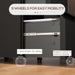 The versatile wheeled base guarantees smooth and effortless movement, even when the unit is fully loaded. The thoughtfully designed lock mechanism includes two brakes to securely park the cabinet, complemented by an extra middle wheel that adeptly prevents the cabinet from tipping forward when the drawers are open.