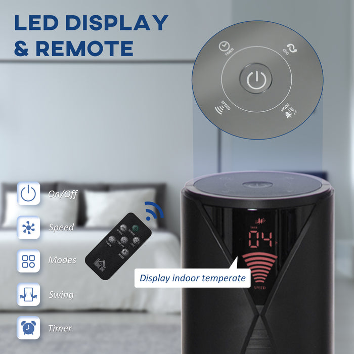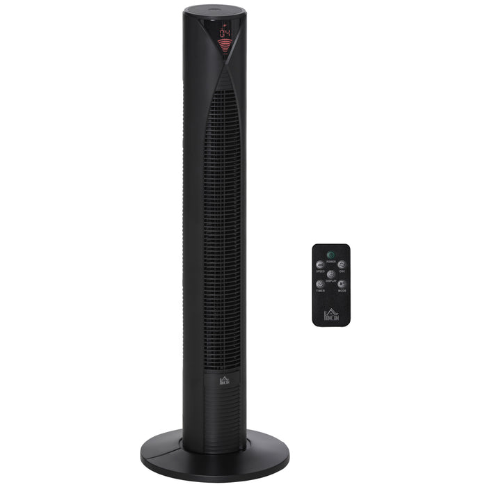The tower fan is complete with a sophisticated black remote control, making adjustments a breeze from anywhere in the room. It also includes an integrated carry handle for portability. The unit's assembly is quick and straightforward, so you'll be enjoying cooler air in no time.