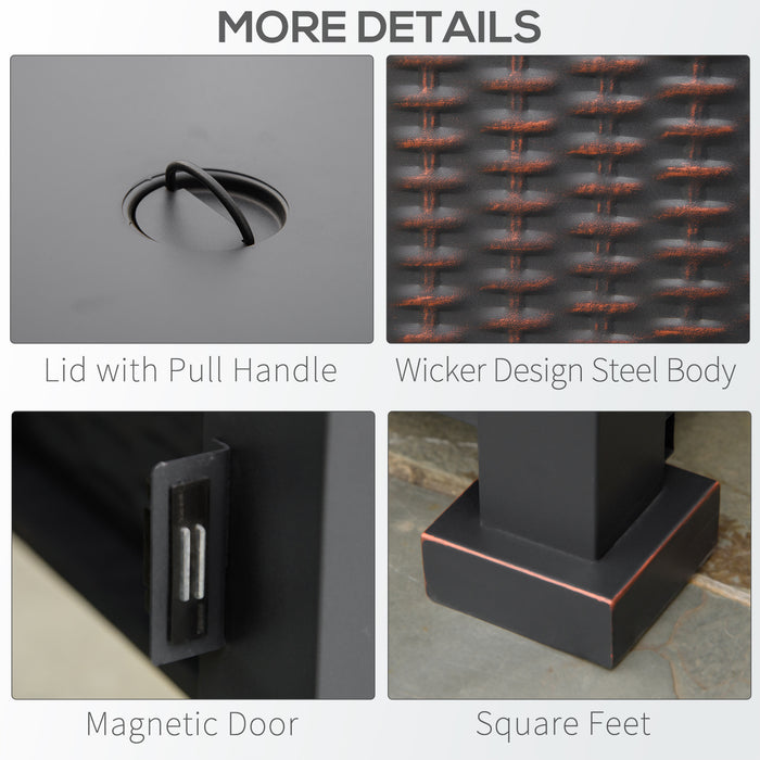 Our fire table boasts a durable metal frame with a stylish rattan-style pattern. Its sleek black finish complements any outdoor decor theme, making it an ideal choice for patios, decks, and garden areas. The cleverly integrated lid quickly transforms the fire pit into a full-fledged table, perfect for social gatherings or intimate al fresco dining.