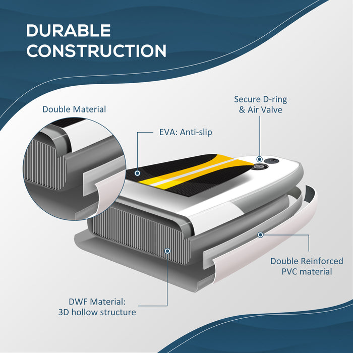 Constructed from elite materials that lavish care upon your skin, our paddleboard boasts a thickened PVC brushed cloth that can bear a load of up to 120 kg effortlessly. The non-slip EVA deck enhances your grip and ensures traction during the most challenging or tranquil water escapades.