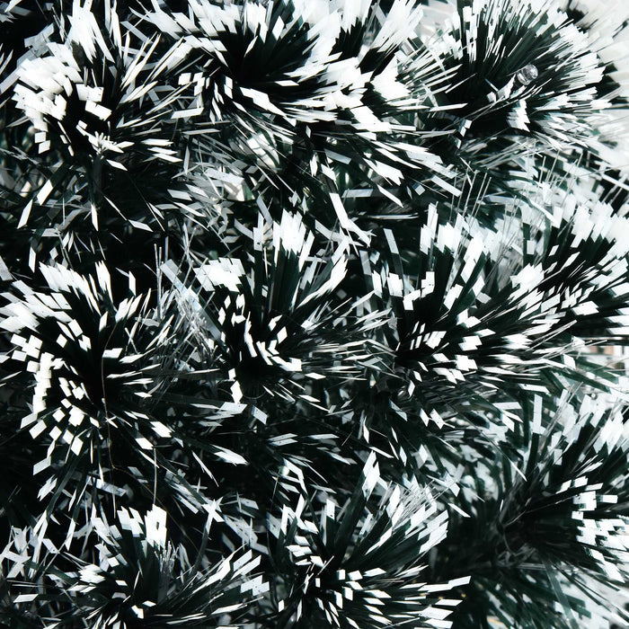 Exuding charm with its dual-tone palette of green and snowy white, and equipped with dazzling RGB lights, our artificial tree is crafted with high-quality PVC and Steel, finished with a flame-retardant coating for your peace of mind. Experience the ease of setup with a convenient 1.8-meter cord length, and bask in the glow provided by the harmonious arrangement of lights and fiber optics.