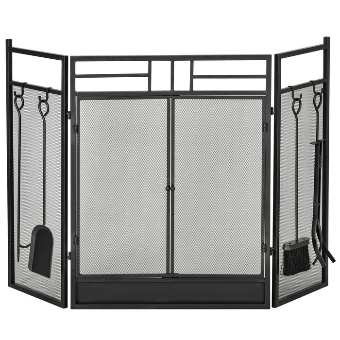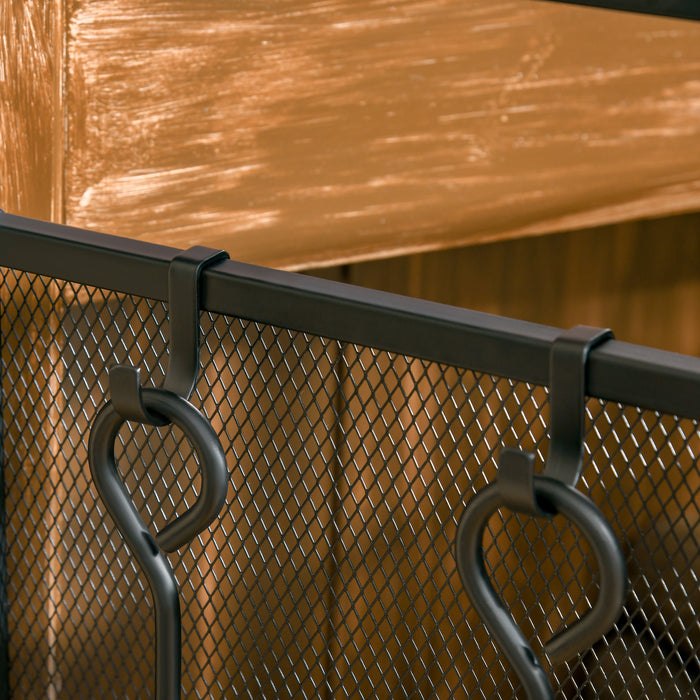 A complete set of essential fireplace accessories including a broom, shovel, poker, and charcoal tong accompanies your purchase. These tools aid in fuel management and maintain the cleanliness of your hearth area. The supplied hooks provide an organized method to display your tools on the guard itself, ensuring they are always within reach.