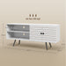 Constructed with a foundation of solid pine legs, this entertainment console offers unwavering support and durability. Each leg is meticulously crafted to bear the weight of your multimedia setup. The melamine-coated finish not only imparts a smooth touch but also provides an understated protection to its surface.