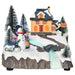 - Christmas village scene includes a house, five trees, snowmen, a fiber optic river, and two moving skaters