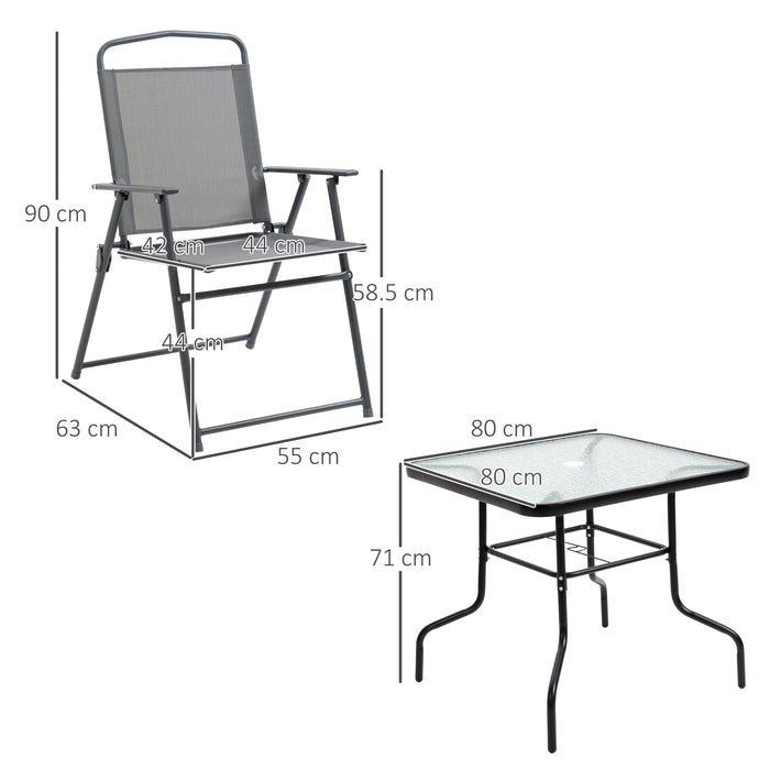 Adorned with a tempered glass tabletop, the dining set exudes a water ripple effect, offering a refraction of light that complements its environment. Its sturdy surface is not only striking but practical, lending itself to a hassle-free cleaning routine. Dimensions: Table: 71H x 80L x 80Wcm. Chair: 90H x 55W x 63Dcm. Chair folded: 6H x 85L x 55Wcm.