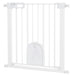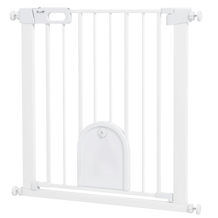 Designed with your pet's independence in mind, this gate includes a small flap allowing smaller pets to pass through as needed. Additionally, the door swings open in both directions and comprises a mechanism that automatically closes the door if left at an angle less than 90 degrees, while staying open beyond 90 degrees.
