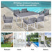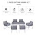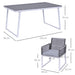 The dining set features a chic grey palette, seamlessly blending with any outdoor decor. Its construction involves high-quality steel, PE rattan, and polyester, ensuring durability and long-lasting beauty.