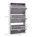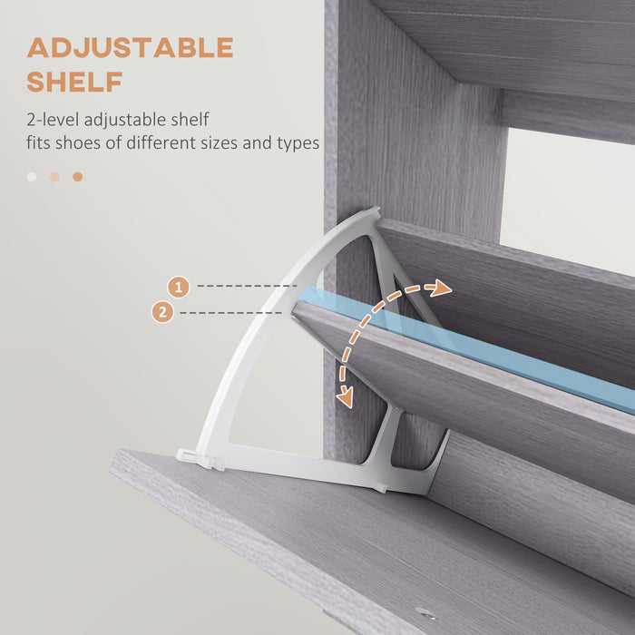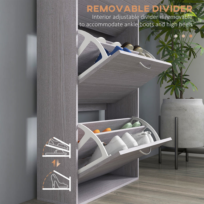 This slimline shoe cabinet is the model of efficient space use. Perfectly tailored for narrow corridors or snug bedrooms, its slender dimensions ensure that even the tightest of spaces can offer a substantial storage option. The cleverly crafted flip drawers offer immediate access to your footwear, providing a meticulous method to arrange up to 12 pairs of shoes.