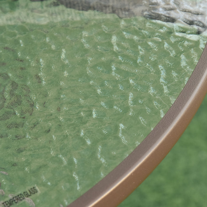 The table centerpiece of this set glimmers with a 5mm thick, silk-screen finished, tempered glass top, adding a touch of glamour to your outdoor space. Encased by a sleek black metal rim, the table's surface not only offers elegance but also functionality with its centralized parasol hole which can be capped when not in use.