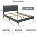 Colour: Black/ Grey Material: Steel, MDF, engineered wood, sponge, linen fabric Product size: 205 x 150 x 105 cm (L x W x H) Net weight: 26 kg Weight capacity: 300 kg Mattress eecommended: 200 x 150 x 25 cm (L x W x H) (not included) Package includes: 1 x King size bed frame 1 x Instruction manual