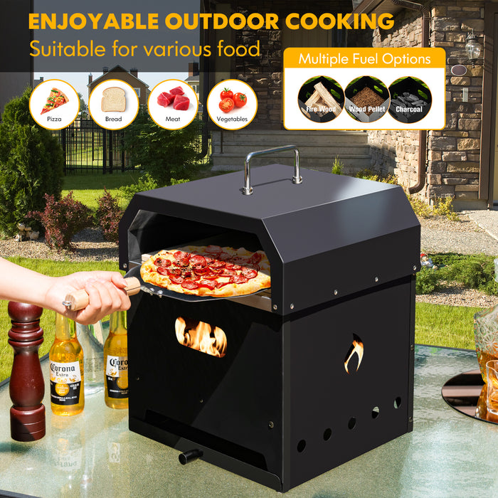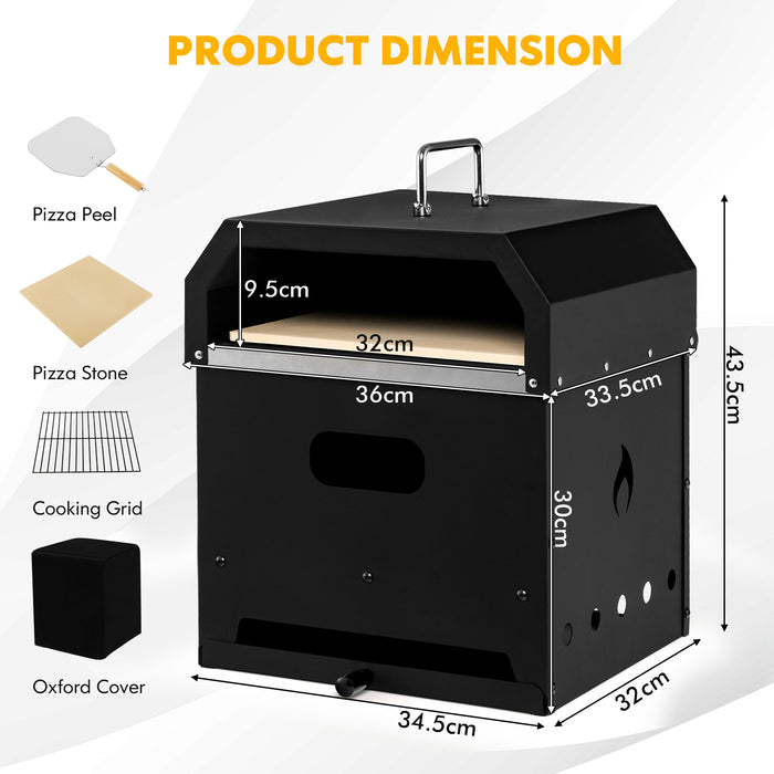 The thoughtful design incorporates multiple fuel options and efficient side vents to promote air convection for superior combustion. Cleaning up is a breeze with the included ash tray designed to catch residual ash. Moreover, the oven is equipped with a top handle and side handles for easy transport, enhancing your outdoor experiences, whether it's a backyard party or a camping trip.