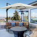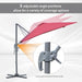 Experience the freedom to adjust your shade as the sun travels across the sky. Our cantilevered garden umbrella not only boasts a full 360° rotation but also includes a tilting mechanism with three distinct positions. This flexibility allows for uninterrupted enjoyment, from the first light of dawn until the evening's last rays.
