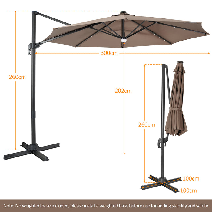 - Packaged contents include: 1 x LED Cantilever Umbrella, 1 x Metal Base, and 1 x User manual