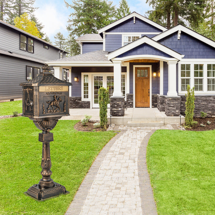 The mailbox's vintage visage, featuring petite roofs, intricate side reliefs, and floral-patterned columns, exudes a luxurious and sophisticated aura. Whether you choose the aged bronze finish or the classic black, this outdoor mailbox is sure to contribute to the overall aesthetic of your domicile while serving a practical purpose.