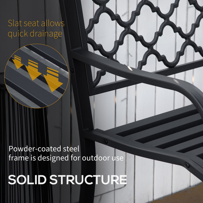 Built to last, this outdoor bench boasts a robust construction of steel tubing and cast iron. Its powder-coated finish not only adds to the visual appeal but also reinforces the bench's strength, ensuring it remains a mainstay in your garden for years to come. The slatted seat is not only stylish but functional, allowing for quick drying after a rain shower.