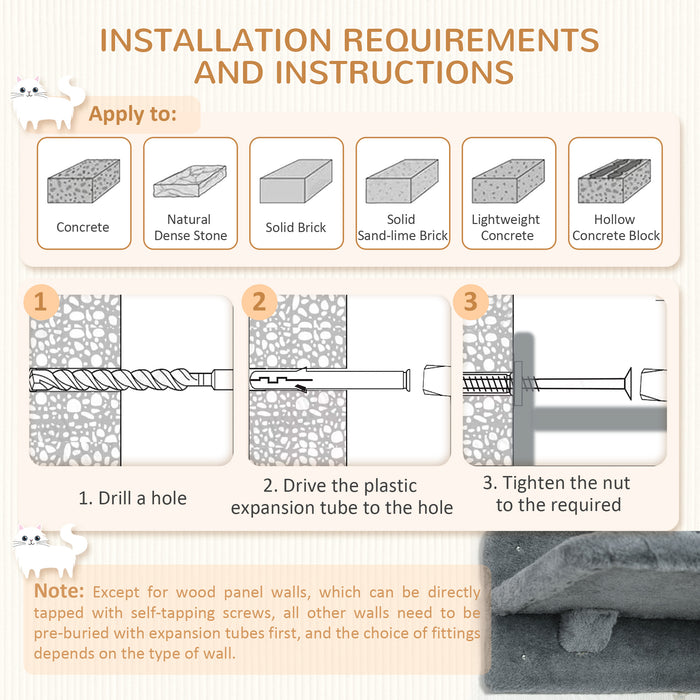 This modern cat wall fixture can integrate seamlessly with your living space, while ensuring harmony between your wall's integrity and the shelf's secure installation. Be sure to utilize the proper fixtures depending on your wall type to guarantee stability for your pet's new aerial playground.