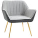 Resting on a robust steel frame, this chair guarantees stability and longevity. The metal-infused construction exudes strength, while the legs, adorned in a radiant gold tone finish, introduce a touch of glamour. This chair does not waver in its duty to provide a haven of relaxation with unwavering support.