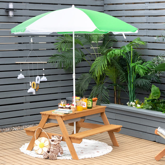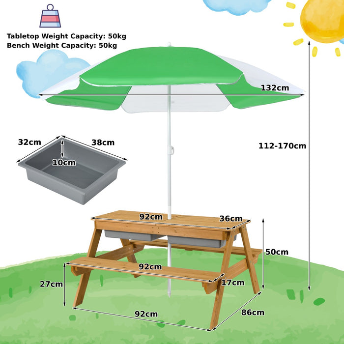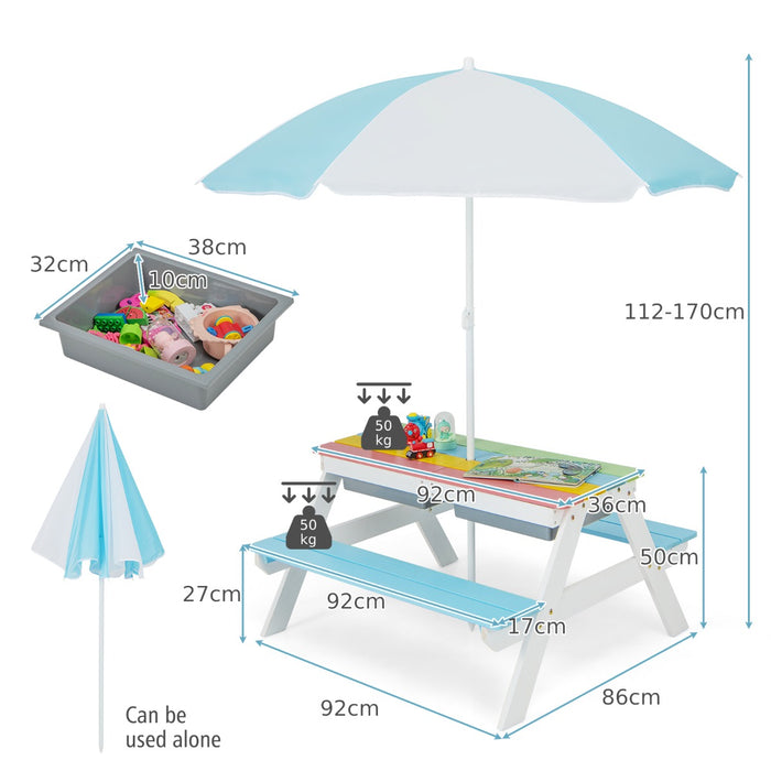 The chic color palette is sure to please both parents and children alike, while the robust material selection promises longevity and safety. The table measures 92cm in length, 86cm in width, and 50cm in height, providing ample space for children aged 3 to 7 years. The umbrella spans 112 - 170cm in height and 132cm in diameter for extensive coverage. The two plastic bins each measure 38cm in length, 32cm in width, and 10cm in height. The entire set is lightweight at 8kg, with the table able to support up to 50kg and each bench bearing the same weight capacity. Your package will include 1 kid's picnic table, 1 umbrella, and an instruction manual for easy setup.