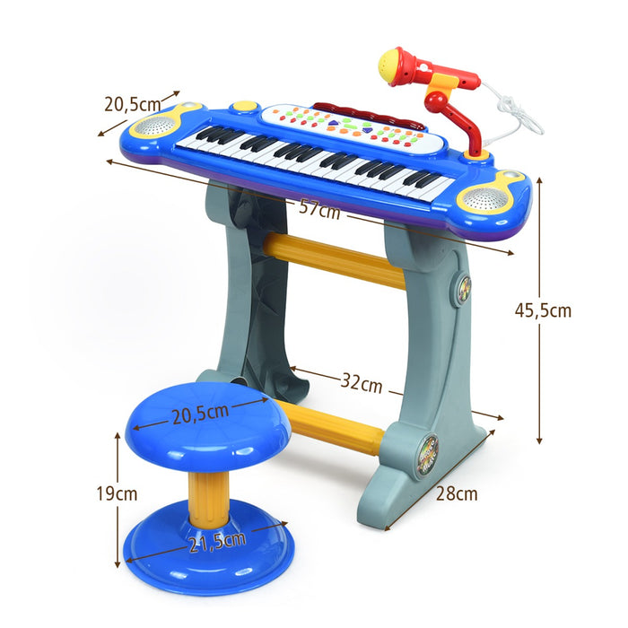 Available in a choice of two vibrant colors, Blue and Pink, our keyboard measures a room-friendly 85 x 27 x 46 cm while the complementary stool measures 20 x 20 x 21 cm. The net weight of approximately 1.5 kg makes it manageable and safe for kids from 3 years old. Each package delivers a complete musical ensemble including the kids' stand keyboard, microphone, stool, USB and MP3 cables, alongside a user-friendly instructions manual.