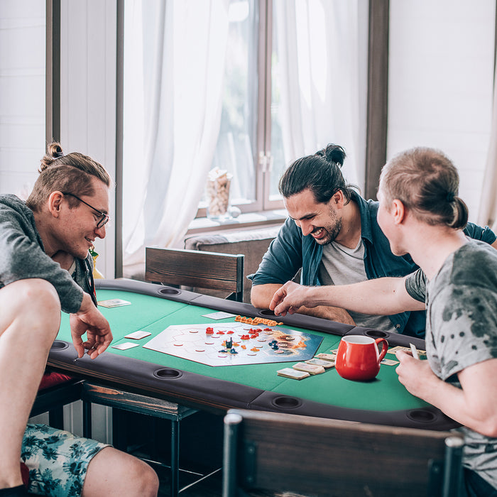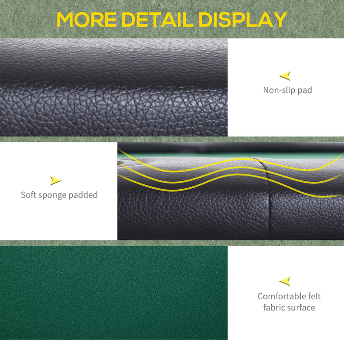 The table’s resilient high-density MDF core stands the test of time, its robustness clothed in a plush light cotton flannel for a smooth, professional touch. The classic green felt surface not only exudes a casino-style ambiance but also ensures optimal card glide for that flawless deal.