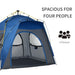 Measuring an ample 199H x 240L x 240W cm, this tent has plenty of room to accommodate a group of four people comfortably. The generous doorway, sized at 129H x 158W cm, invites easy entry and exit, giving it an open and welcoming feel.