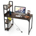 Additionally, it boasts a sturdy metal frame that comes with adjustable foot pads for stability and offers a high load capacity of 150 kg. With a practical bookshelf and anti-falling baffles for secure item storage, it maximizes space efficiency in any room. The spacious desktop caters to a range of activities like working or gaming. As needed, this desk can be used as a laptop workstation, gaming table, vanity table, and more. Bullet Point:Convenient Charging Station: The computer desk is equipped with a built-in power strip, featuring 2 AC outlets rated at 250V/13A, a USB A port at 5V/3A, and a USB C port at 5V/3A. This workstation ensures all your devices are within easy reach and always powered up. Well-Organized Workspace: The study writing desk includes an additional bookshelf that fully utilizes vertical space, complete with anti-falling baffles to keep your items secure. It is the perfect solution for small spaces, allowing you to organize your essentials without taking up extra floor area. Robust and Stable Structure: Constructed with a strong metal structure, the PC desk provides a substantial load capacity of 150 kg. In addition, this table is equipped with adjustable foot pads for optimal stability on uneven surfaces. Versatile for Various Uses: With a spacious desktop, the computer desk is suitable for a wide range of activities, including working, studying, gaming, and more. Its design makes it a perfect fit for various locations such as a home office, living room, bedroom, and beyond. Stylish Design and Easy to Maintain: The 120 cm x 65 cm x 130 cm home office desk boasts a stylish design that complements any decoration. Meanwhile, its surface is smooth and effortless to maintain, ensuring it stays looking pristine for years to come.