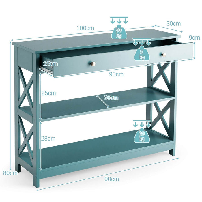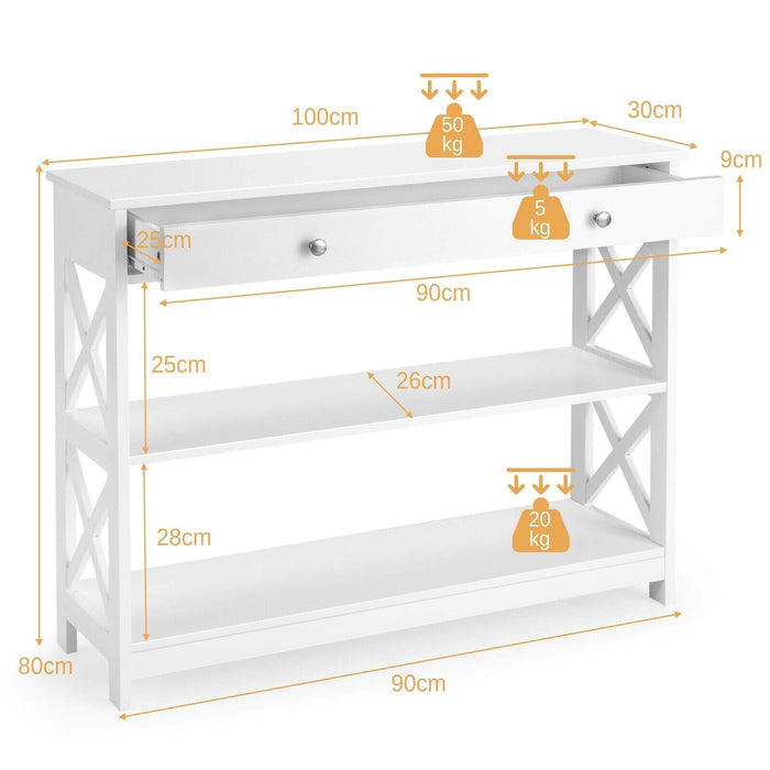 The console table dimensions of 100 cm in length, 30 cm in width, and 80 cm in height, provide a generous surface area to showcase your treasured photo frames, art pieces, and keepsakes with grace. Below the tabletop, a sizeable drawer glides smoothly to house your essentials like keys and glasses. Complemented by two additional shelves, the unit is perfect for arranging your favorite literary works or decorative items in an organized manner.